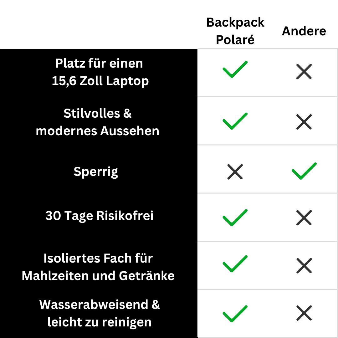 Unser "Backpack Polaré " verbindet Style und Effizienz in noch nie dargewesener Weise. Seine 3-in-1 Funktionalität bietet ein 15,6 Zoll Laptopfach, ein isoliertes Lunchboxfach und ein geräumiges Hauptfach. Perfekt für die Arbeit, Reisen und den täglichen Gebrauch - Ordnung und Funktionalität perfekt vereint.